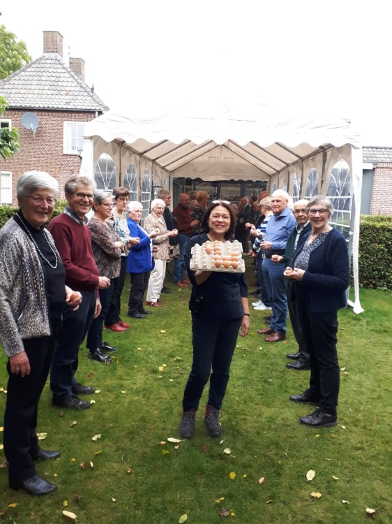 Op een uiterst humoristische wijze werden we op de hoogte gebracht van allerlei interessante kip- en ei-weetjes inclusief het ontstaan van een ei met twee dooiers. De scharrelkippen (witte en bruine) zijn gehuisvest in verrijdbare kippenkooien en wandelen zelfs naar buiten. Van de eieren worden allerlei producten gemaakt; zoals pasta’s en vier soorten heerlijke advocaat en omdat de klok inmiddels 15.00 uur had geslagen was het volgens Conny de hoogste tijd om deze heerlijkheid te gaan proeven.