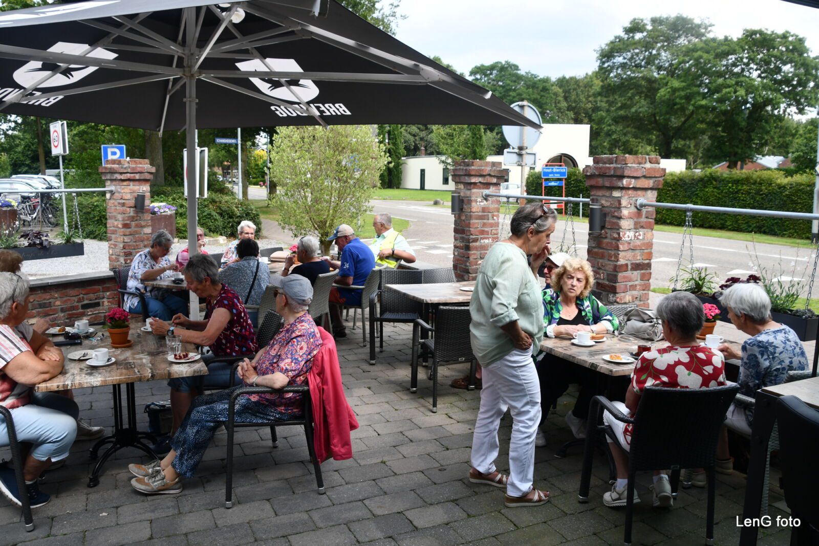 De tocht werd daarna wederom met een omtrekkende beweging en ditmaal zonder verdere onderbrekingen voortgezet via Hout-Blerick, De Boekend, het Rooth naar Eetcafé De Elze aan de Baarlosestraat in Hout-Blerick. Daar werden de deelnemende leden op het terras door de vereniging getrakteerd op koffie/thee en een stuk vlaai. Nadat de penningmeester namens de KBO afgerekend had, was het nog maar een kleine 5 km om de geslaagde tocht op de Markt af te sluiten.