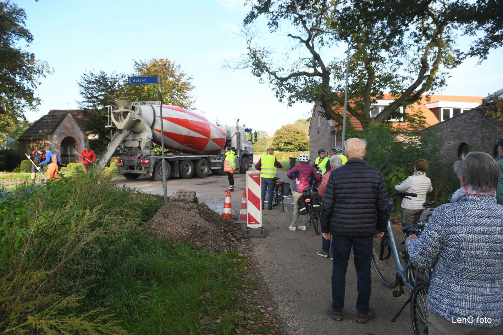 Met af en toe een voelbare wind moest er na een kilometer of acht noodgedwongen gestopt worden omdat er aan de weg bij het kapelletje op Lang Hout gewerkt werd. Maar na enkele minuten wachten kon er verder gefietst worden richting Helden waar in het Kerkeböske de koffie en thee klaar stonden en waar uit vijf soorten vlaai gekozen kon worden. De tocht werd na deze eerste pauze voortgezet richting Roggel waar in de kantine van de plaatselijke voetbalclub geluncht werd en de koffie en thee geserveerd werd die door de KBO werd aangeboden. Het zonnetje scheen af en toe en daarom nuttigden een groot aantal deelnemers hun mee gebrachte brood op het terras. Tussendoor kregen de uitzetters van de tocht te horen dat er verschillende mensen nu weer op plekken geweest waren, waar ze nog nooit gefietst hadden.