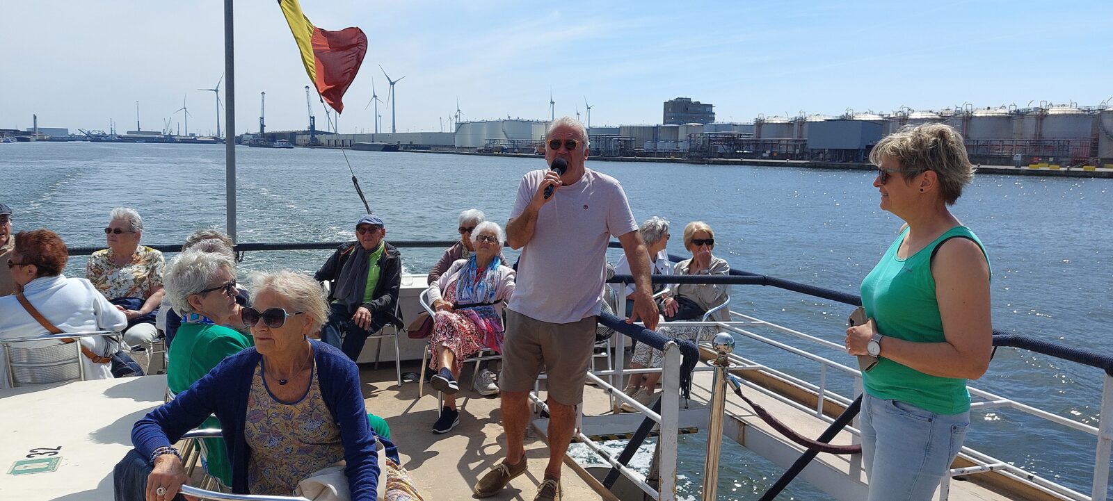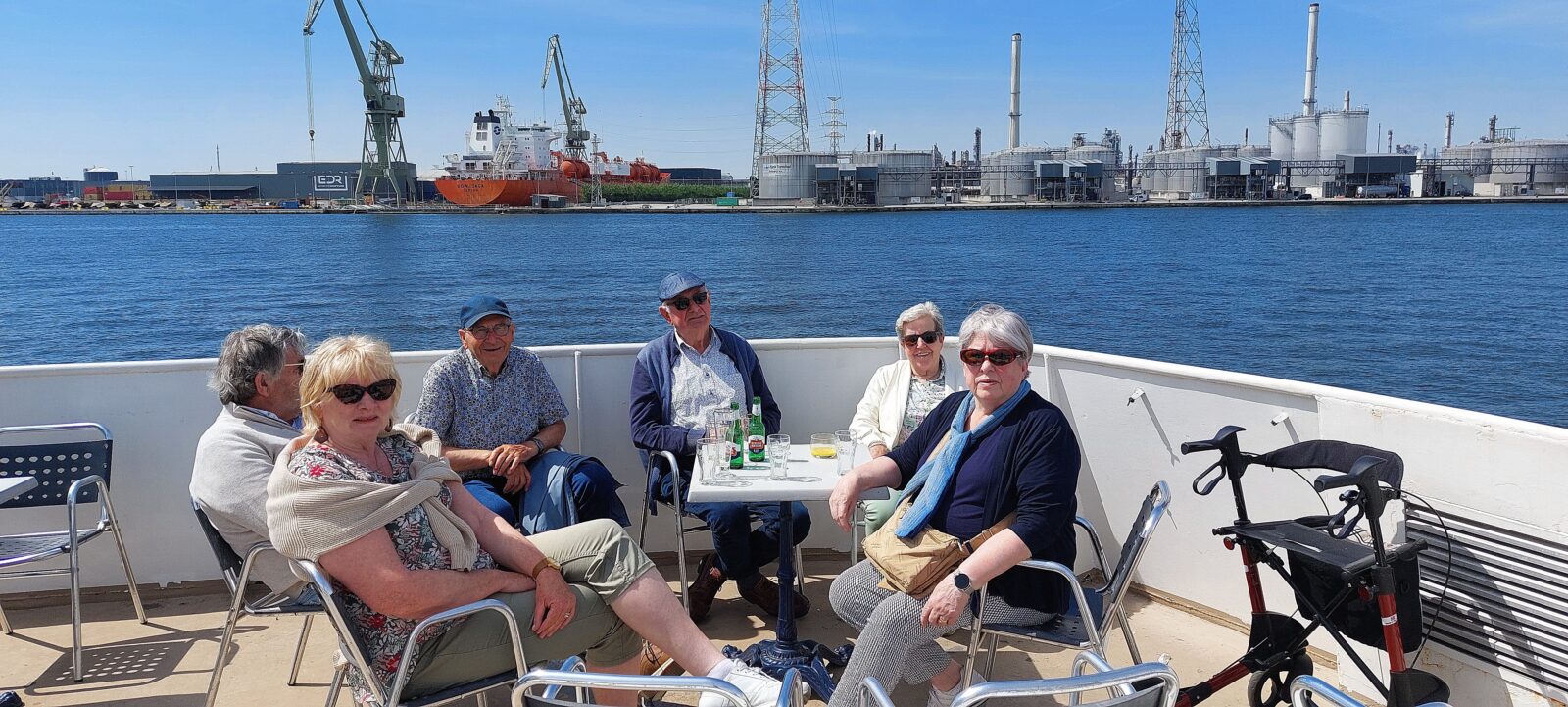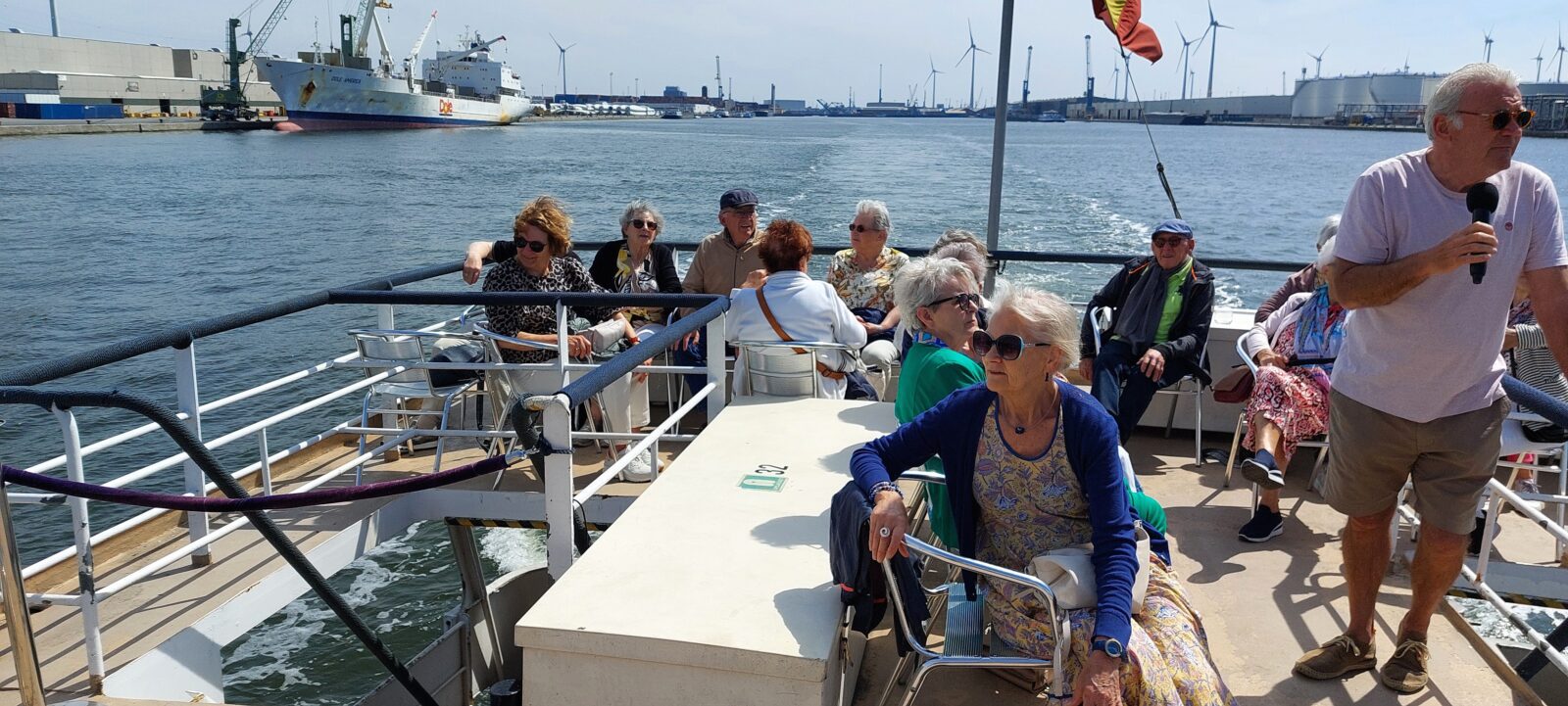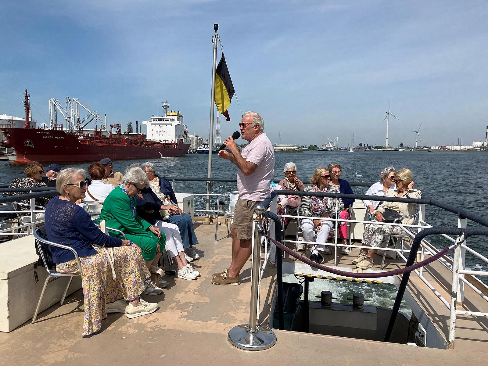 In alle vroegte vertrok onze bus richting Antwerpen onder het genot van een heerlijk ochtendzonnetje. Ondanks de diverse verkeersperikelen en een onverwachte politiecontrole arriveerden we toch nog op tijd bij de boot. Wat een schitterende vaartocht was dat, waarbij de deelnemers al die bedrijvigheid in de Antwerpse havens vanaf het water hebben kunnen aanschouwen. En dat mede dankzij de geweldige uitleg door onze enthousiaste en humorvolle gids Patrick.