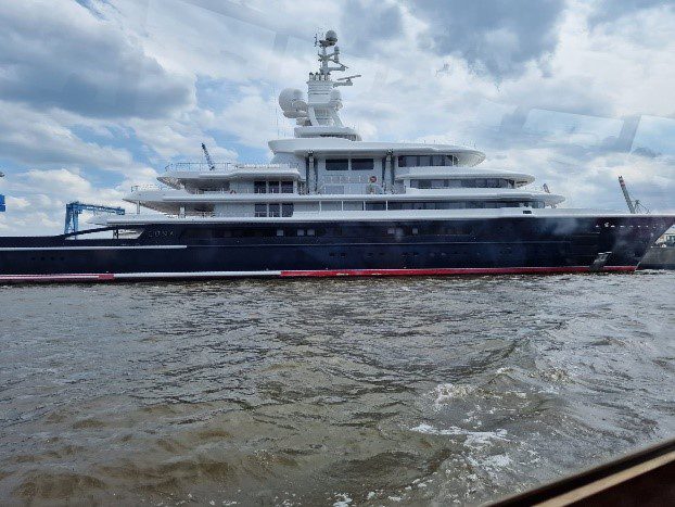 Eigenlijk zouden we ’s middags naar het stadhuis van Hamburg gaan, maar vanwege een ingelaste raadsvergadering waren de veiligheidsmaatregelen aangescherpt en konden wij er niet terecht. Bert en Will hadden dat op het laatste moment te horen gekregen en in overleg met Roland was gekozen voor een rondvaart over de Elbe en door de haven De kapitein voerde ons langs containerschepen, luxe jachten, marineschepen en zelfs een cruiseschip en vertelde humoristisch met een licht Hamburgs accent over de activiteiten in de haven.